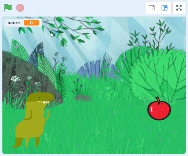 判断苹果是否碰到恐龙,一旦碰到则隐藏,当绿旗被点击时将苹果切换至显示状态,准备进行下一次游戏。