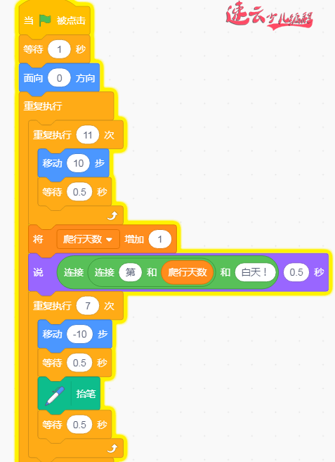5.通过“重复执行”模块,让小蜗不断的向上爬然后掉落: