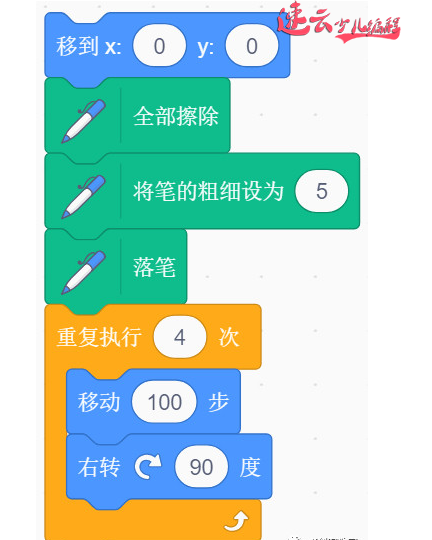 这里我们使用了循环执行4次这个指令,因为移动加转弯这个命令,在绘制正方形的时候需要连续执行4次。为了简化程序,可以通过重复执行的命令来实现。