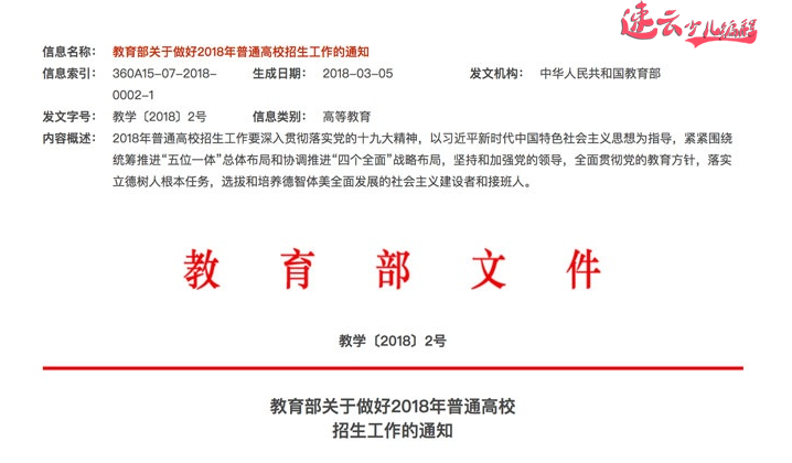 近日,教育部印发《关于做好2018年普通高校招生工作的通知》,对今年普通高校招生工作进行全面部署。要求各地各校深入贯彻落实党的十九大精神,全面贯彻党的教育方针,全面落实《国务院关于深化考试招生制度改革的